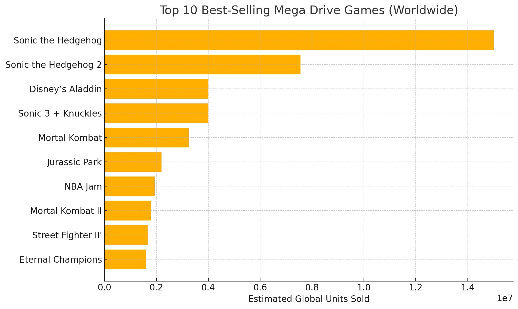 When most people think of the Mega Drive, they think Sonic the Hedgehog. And rightly so — it was not just a mascot, but a movement. Globally, Sonic the Hedgehog (1991) shipped over 15 million units, thanks in part to being bundled with the console.