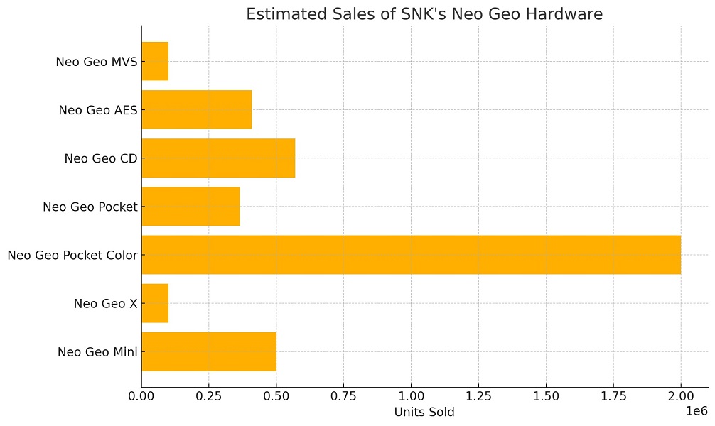Below is a visual comparison of the estimated sales figures for SNK's Neo Geo hardware. This highlights the relative success of each system across the home, handheld, and arcade markets.